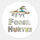 Fossil Hunter graphic shows a keen collector examining part of a fossil with the remains still buried below ground. Below are the words "Fossil Hunter" with the letters occasionally broken like a fossil might be. A fun design for fossil hunting fans.