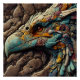 A portrait of an ancient extinct bird of prey in the rocks, created in embossed style with hues like turquoise, deep yellow, orange, and blue, with rocks in the background, with a realistic open-eye effect adds a magical touch to this enchanting and colourful artwork.