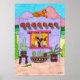 These four curious cats are sitting in the pink-and-talavera framed window and on the roof of a pleasingly purple Taos-style adobe dwelling in the American southwest. Richly textured cacti and succulent plants in colourful talavera pots accent the house, providing a welcome contrast to the desert sand, where a lizard sits nearby. Pink and lavender mountains, as well as greenery, brighten the background beneath a cloudless bright blue sky.