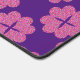 Hand-made sewn pink, purple, flowers from fabric with pink pearl on the middle of flower on purple background.