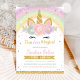 Celebrate her fourth birthday with this enchanting Four Ever Magical Unicorn invitation! Featuring a whimsical unicorn, vibrant rainbows, and sparkling gold accents, this design sets a dreamlike tone for a special 4th birthday party. Easily customise the text to include your event details for a professional, high-quality look. Perfect for little girls who love magic, fantasy, and all things sparkly!