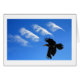 Four feather shaped clouds lined up in the sky with a raven flying in the foreground.