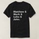 four gospels of matthew mark luke and john tshirt. This Christian tshirt gives the message of Jesus with a smile by quoting the four gospels of Matthew, Mark, Luke and John in the meme style popular with culture classics. Give the Bible message with love and humour and fun with the perfect gift at any time of year not just the Christmas holidays.