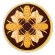 Four heraldic bees in a patterned group on rich chocolate brown