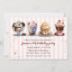 Celebrate the sweet birthday kid with a make-your-own sundae party. Four loaded ice cream sundaes are featured on the top of this invitation featuring a light striped background reminiscent of a sweet shoppe. Sprinkles and drips of chocolate scatter around the invitation. Perfect for a make-your-own sundae ice cream birthday party, ice cream social, or fundraiser. Available with matching products.