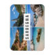 Rectangular fridge photo magnet with a souvenir collage of four landscape photos of the beautiful beaches on the mediterranean island of Sardinia, Italy and the italian text: 'Sardegna', meaning Sardinia.