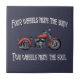 "Four wheels move the body, two wheels move the soul," text with a heavenly machine. T-shirts, sweats, cards, novelty gift swag.