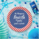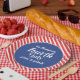 This design features a simple blue-white star pattern, a fourth 4th of July holiday, with calligraphy script custom personalisation a summer picnic BBQ outdoor cookout, a simple minimalist minimal design, a basic simple star pattern, a Fourth of July party supplies, a summer party paper plate, outdoor backyard barbeque party, an independence America American flag, a patriotic stars American flag
