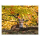 A cute young fox calmly peers from its grassy resting place with a background of autumn colour.