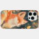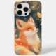 A fox gazes upwards, surrounded by colourful, autumn leaves and softly glowing lights. The rich hues of reds, oranges, and yellows capture the essence of the fall season.