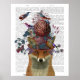 Fox Birdkeeper with Artichoke by Fab Funky. Fox posing with birds and an artichoke atop its head. Has a book page for a background. | 192164D