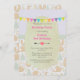 A cute childrens birthday invitation with the top half decorated with a lavender purple background and a colourful bunting banner, The middle has a pastel green banner and the bottom half of this delightful invitation has a pattern illustrated with adorable foxes, cute little birds and whimsical green trees. The centre has a beige frame which holds all your party details.