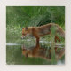 Fox - beautiful colour nature photograph of a wild fox and reflection as fox is stepping into a pond surrounded by greenery.