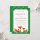 The text is in a green frame on a green stripes background. In the lower part of the frame, under the text, there are 2 cute red foxes, the bigger mama fox and the smaller baby fox pup, painted in watercolor. Above them there is the text: the words "baby shower" and are written in a red handwriting script, the name in red caps, the and the date / time in green caps, the rest in smaller black caps. On the back, there are only green stripes. The green stripes pattern alternates two nuances of green, a darker one (forest green) and a lighter, more vivid one.