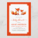 The text is in a red frame on a red stripes background. In the upper part of the frame, above all text, there are 2 cute red foxes, the bigger mama fox and the smaller baby fox pup, painted in watercolor. Under it there is the text: the words "baby shower" and are written in a red handwriting script, the name and the date / time in red caps, the rest in smaller black caps. On the back, there are only red stripes. The red stripes pattern alternates two nuances of red, a darker and lighter, more vivid one.