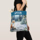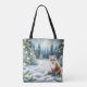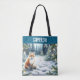 Personalised Christmas tote bag. A cute ai watercolor illustration of a fox sitting in the snow on a cold winter night in a magical winter wonderland.