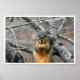 Photograph of a fox squirrel standing in tree with a walnut piece in his hands.