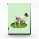 Pictured on guard and in his stance is a little brown and white Fox Terrier