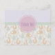 A postcard with a pattern illustrated with adorable foxes, birds and whimsical trees. The top half has a lavender purple background with a linen style texture. The centre has a pastel green banner. A pink circle holds the words "Thank You'. I think this whimsical pattern is really cute and reminds me of the happy times spent in nature.