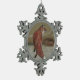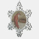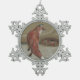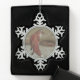 a red fox watches over her cubs in a snowy wooded landscape on this pewter snowflake for your tree. Artwork 'vixen and cubs' by J.M.Tellam BA (hons) copyright Mindgoop