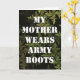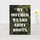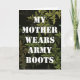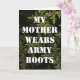 A Mother's Day card for a military mum. Features a brown and green fractal leaf/needle pattern camouflage suitable for either coniferous or deciduous forests. Customisable text on teh cove reads "MY MOTHER WEARS ARMY BOOTS." Customisable text inside reads "HAPPY MOTHER'S DAY!"