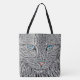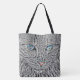 A custom all-over-print tote bag that features a black and white artistic fractal cat background on both sides of the bag.