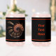 A multi-coloured (red, yellow and orange), spiralling fractal image, resembling a bird or feathered dragon, on a dark background. Customise by adding your own text on the reverse side. You may change both the text colour and font.