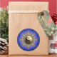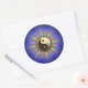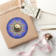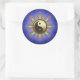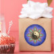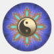 Vibrant blue purple fractal art flower with orange and aqua centre + gold yin yang symbol in the centre representing balance