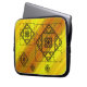 Three styles of hand-drawn fractals, including Siepinski triangles, Apollonian gaskets, and a similarly themed square design, make up the layers of this geometric mandala, overlaid onto a bright yellow and orange gradient.