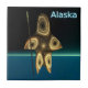 A brown-toned fractal image suggesting a highly-stylised Inuit hunter, wearing traditional fur clothing, holding a harpoon with an ivory head. The image is superimposed on a background depicting the dark polar winter. Text reading "Alaska" appears in glowing blue and white.