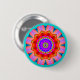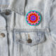 A colourful geometric mandala button badge.