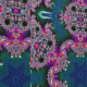 This image is a vibrant, kaleidoscopic fractal artwork bursting with intricate patterns and swirling designs. At its center, a deep blue star-like shape radiates outward, surrounded by spiraling tendrils of vivid pink, purple, and orange hues. The intricate loops and curves create a mesmerizing symmetry, while hints of green and teal add depth and contrast. The artwork evokes a sense of infinite complexity and cosmic wonder, blending elements of geometry and organic flow into a hypnotic, otherworldly design. Perfect for those drawn to the beauty of mathematical art and abstract expression.