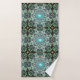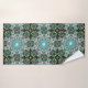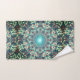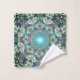 A kaleidoscope design of green, blue, orange and tan squares in a mosaic-like pattern with a teal fractal sun that glows with illumination at its centre. Trippy boho chic.
