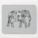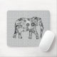 Mixed pattern digital graphic of a richly embellished elephant against an arabesque tiled background - Fractal swirl pattern in black, white and shades of grey / grey against a silver grey background