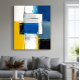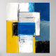 A burst of vibrant colours like yellow, blue, and white, interwoven with black strokes, forms an abstract composition reflecting chaos and balance. Paint layers suggest emotional depth and movement, inviting personal interpretation.
