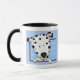 Our cute Dalmatian mug has the famous spotted dog drawn as a cartoon! His head is slightly at an angle as he looks out curiously. The frame's background is blue striped. His black and white paws are on the edge of the picture frame. Unique Dalmatian gifts featuring your favourite dog breed. This design is available on other dog lover merchandise too.