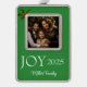 Framed photo ornament is shown in silver tone metal with a green color background and a sample photo, customize this ornament and just change the photo to your own great photo and change the text if you wish with this template.