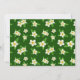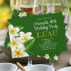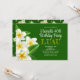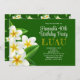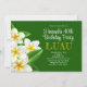 Birthday party invitations with a luau theme. White Hawaiian flowers with green leaves is the design on green paper, with optional upgrades and download available. Customise gold and off-white text with party information using modern fonts. Frangipani flowers, also called plumeria, have golden yellow centres. The reverse has a pattern of flowers.