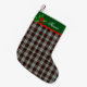 Lovely plaid Christmas stocking done in the red, green, black, and white traditional Fraser Dress tartan pattern. The top front of the stocking is done in green, with a red accent band below it, and graphics of a festive green and red holly sprig, on the left. Personalise the white text to suit your needs.