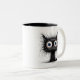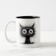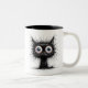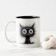 A very frazzled-looking black cat with bloodshot eyeballs bulging out.