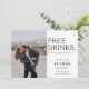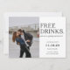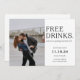 Fun and casual Save the Date announcement featuring "Free Drinks" in a fun script. Announce to your friends and family that you are getting married! Customise with your information and photo.