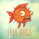 Vector cartoon illustration of a wacky porcupine blowfish or pufferfish with Free Hugs text. Tags: pufferfish, puffer fish, fish, puffer, sea, ocean, marine life, sea life, ocean life, porcupine, spine, spiny, spike, sharp, pointy, blow, blowfish, animal, free, hugs