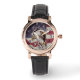 This women's rosegold and vintage black leather strap watch features a bald eagle breaking through to freedom with an American flag background. You can keep or change the background graphic, and add text with the Zazzle 'design tool'. Water resistant up to 90 ft. Includes one year manufacturers limited warranty. Available in several styles.