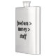 The product is a good size and came exactly as it was pictured. The lid is not attached to the flask, which could be dangerous on drunken nights... The print came out surprisingly well and looks very sharp. Would definitely recommend.