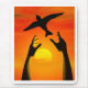 Two arms releasing a bird to freedom with a glorious sunset behind