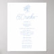 Perfect for grandmillennial brides and lovers of the Old Money aesthetic, this menu sign blends soft French Blue florals with heirloom-inspired design for a polished reception look. Ideal for signature cocktail displays, garden tent receptions, or bridesmaid brunch bars. Style with ivory linens, blue hydrangea arrangements, and silver bar trays for a cohesive setting. Personalize to coordinate with your full wedding suite.