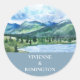 This envelope seal features a watercolor mountain and lake landscape and is part of the Serene Watercolor Lake collection. The background is a beautiful french blue.