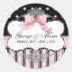 Use stickers to seal invitations, to create gift tags, party favour tags or cupcake toppers. For matching cupcake toppers or gift tags, purchase the 1.5" stickers and follow these directions. For Cupcake toppers, use small coffee stir sticks, large tooth pick or hors d'oerves picks or something similar. Cut out 2" circles of coloured cardstock or craft paper (not included), a 2" craft punch will make this an easy task. Carefully place the stickers over the centred stick and the 2" paper backing. Place picks in cupcakes after frosting and decorating them. This Wedding Ensemble features elegant French copperplate swirls, pink and green dots on a black background, ruffled silk stripes and a beautiful hand painted pink silk bow. All made from original artwork by Audrey Jeanne Roberts. The result is a beautifully contemporary Wedding ensemble. You can easily change the name. NOTE: This is a flat printed design with the appearance of three dimensional aspects. There are no raised layers or actual gold or silver in the design.