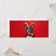 Black and white French Bulldog with red bow tie and golden reindeer antlers, on a red background. The style is fun and quirky.