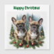 Two adorable French Bulldogs wish Merry Christmas and lie in the Christmas wreath. Everything is festively decorated with globe lights and tinsel. The bulldogs feel comfortable in the Christmas atmosphere.